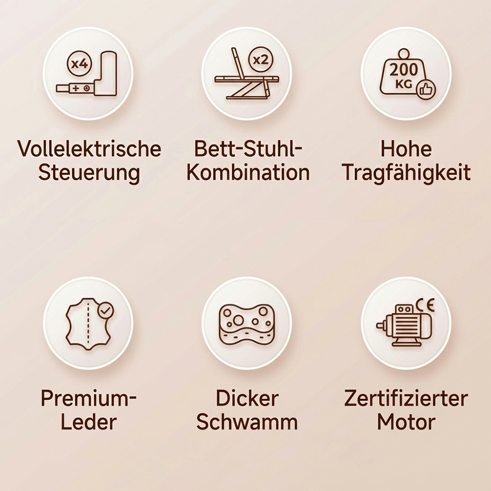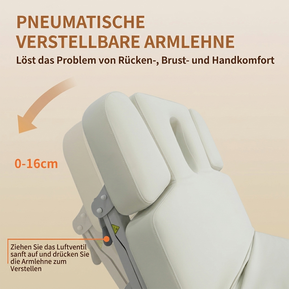 - Höhe, Neigung der Rückenlehne, Dachstellung sowie 2 Fußstützenverstellung mit 4 kraftvolle Motoren per Handbedienung verstellbar