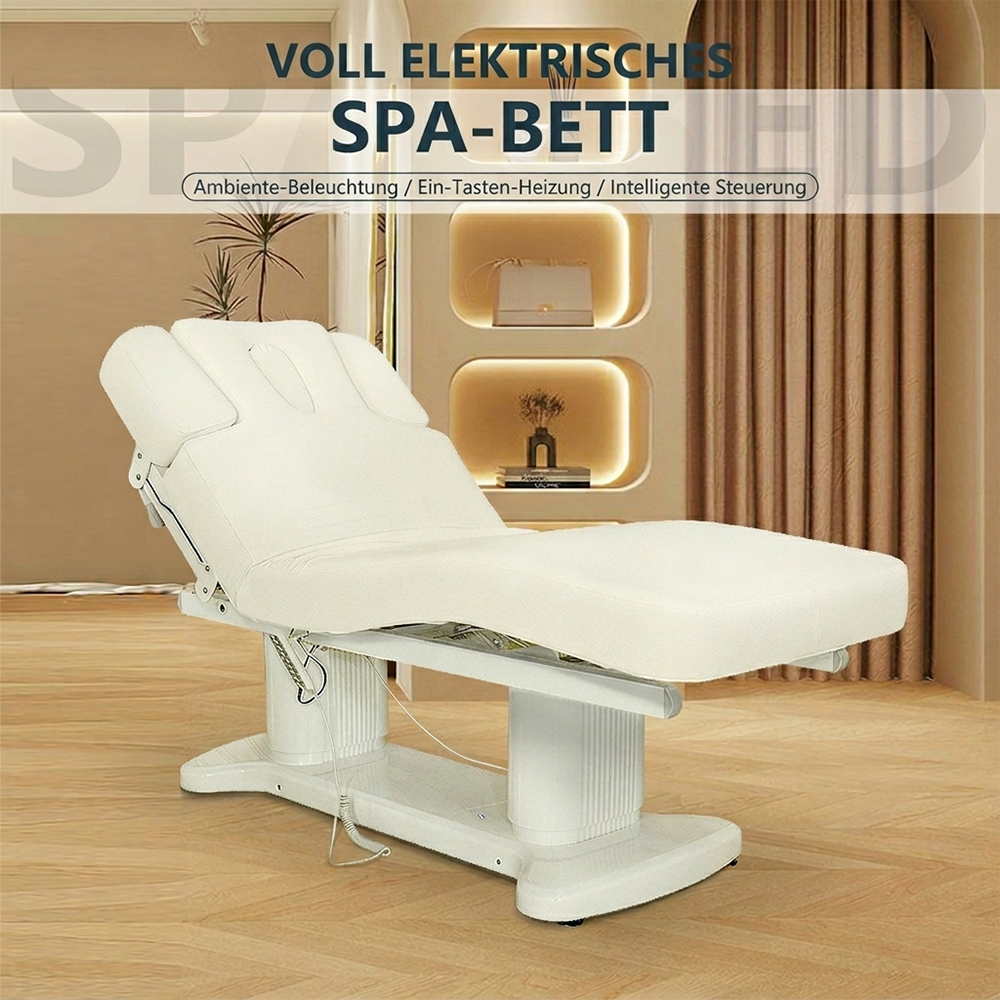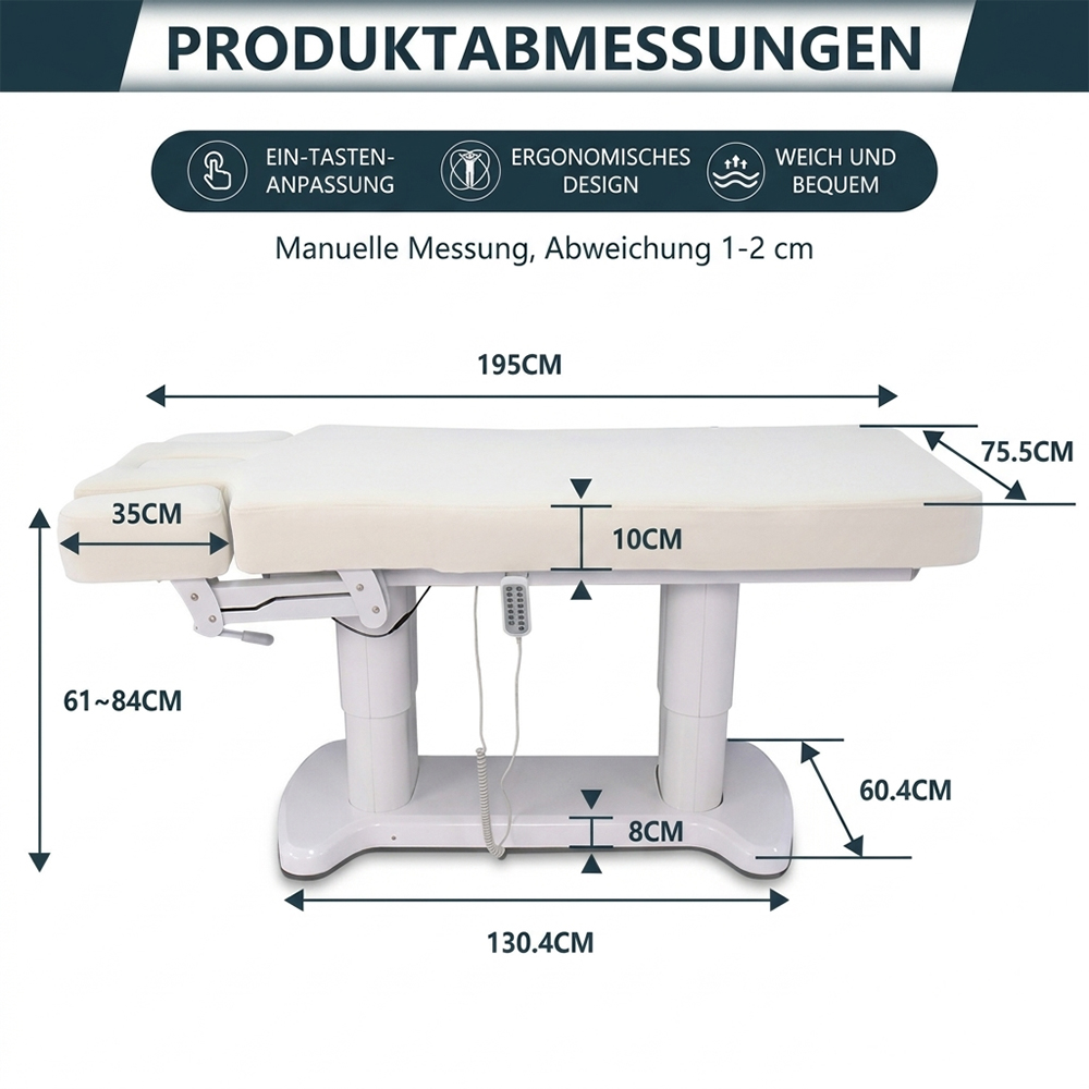 Diese vollelektrische Wellness- und Massageliege ist für den professionellen Einsatz in Massage-, Wellness- und Behandlungsräumen konzipiert. Die Kombination aus stabiler Konstruktion, komfortabler Polsterung und elektrischer Verstellung unterstützt effiziente Abläufe und hohen Kundenkomfort.